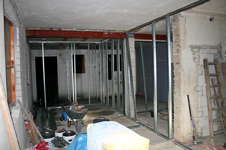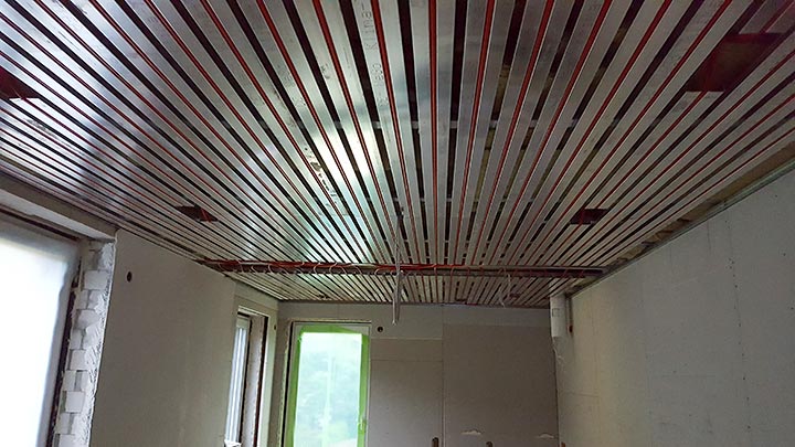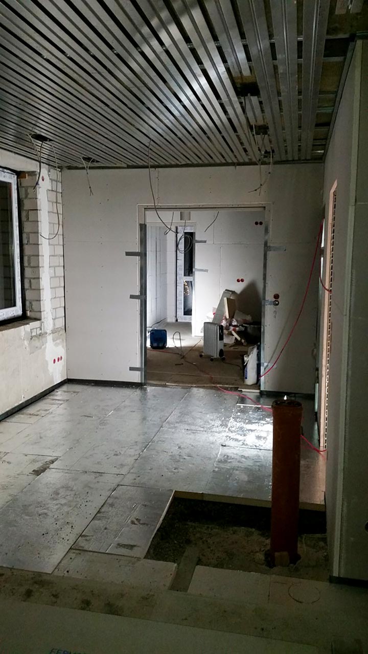 Grundsanierung, Einbau von Heiz- und Kühldecken und Trockenbauarbeiten.